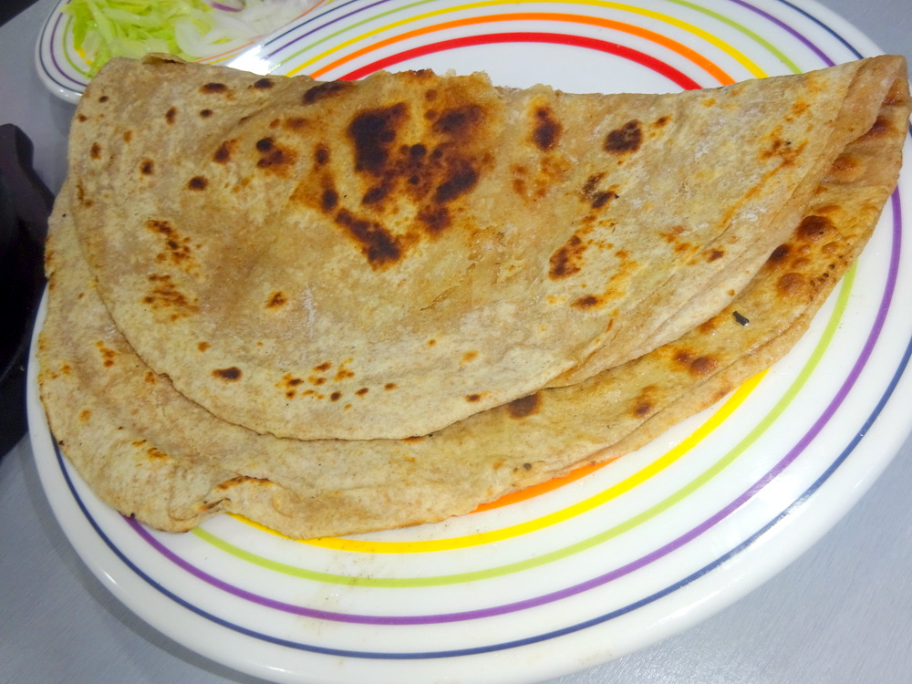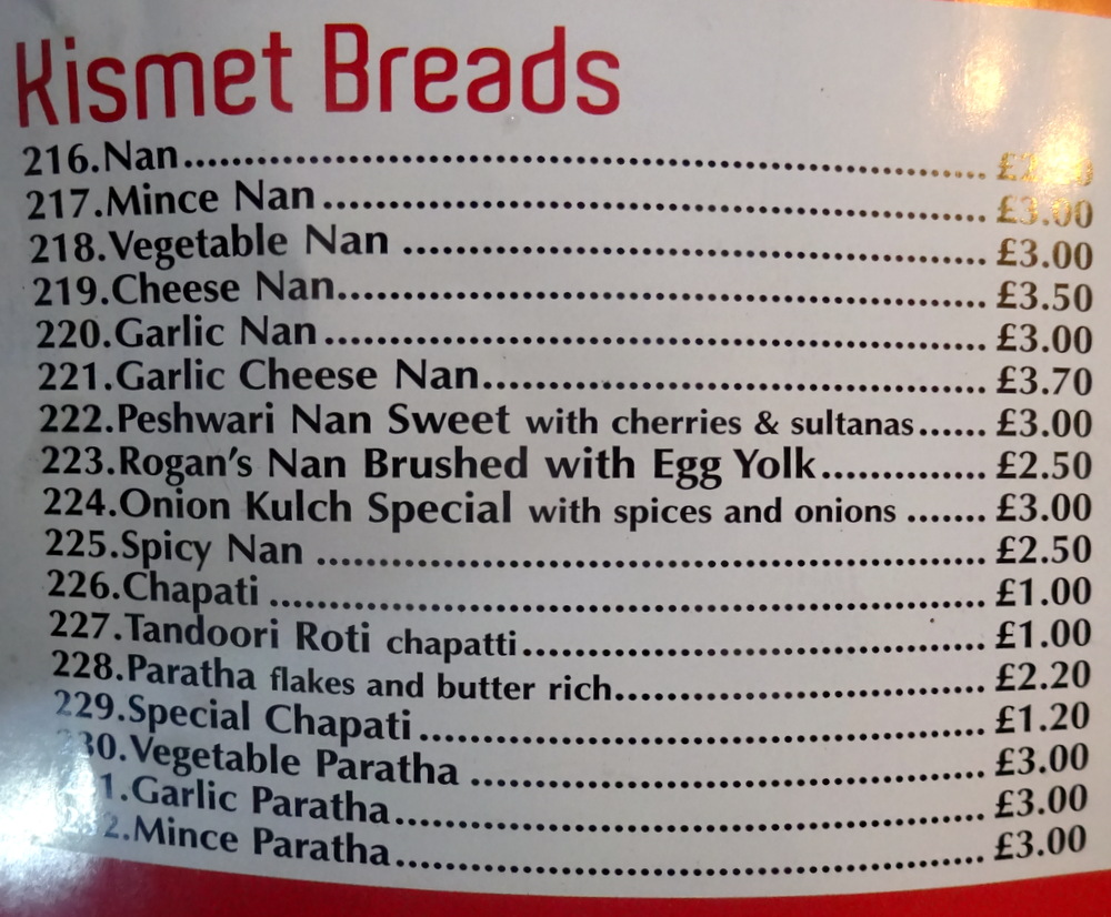 I tried once more to secure a Chilli and Coriander Naan, the Chillies having been invisible on Wednesday. Abbas promised that the Chillies would be rolled into the dough. Mags opted for a Plain Paratha (£2.00). Dr. Stan thought one Tawa Chapatti (£0.70) would be sufficient for himself. John who can eat Chapattis for Scotland would have one of these plus a Garlic Chapatti (£1.00). Abbas had to explain to the Chaps what a Tawa Chapatti is. Does this mean there is no Tandoor at Basharat G’z?