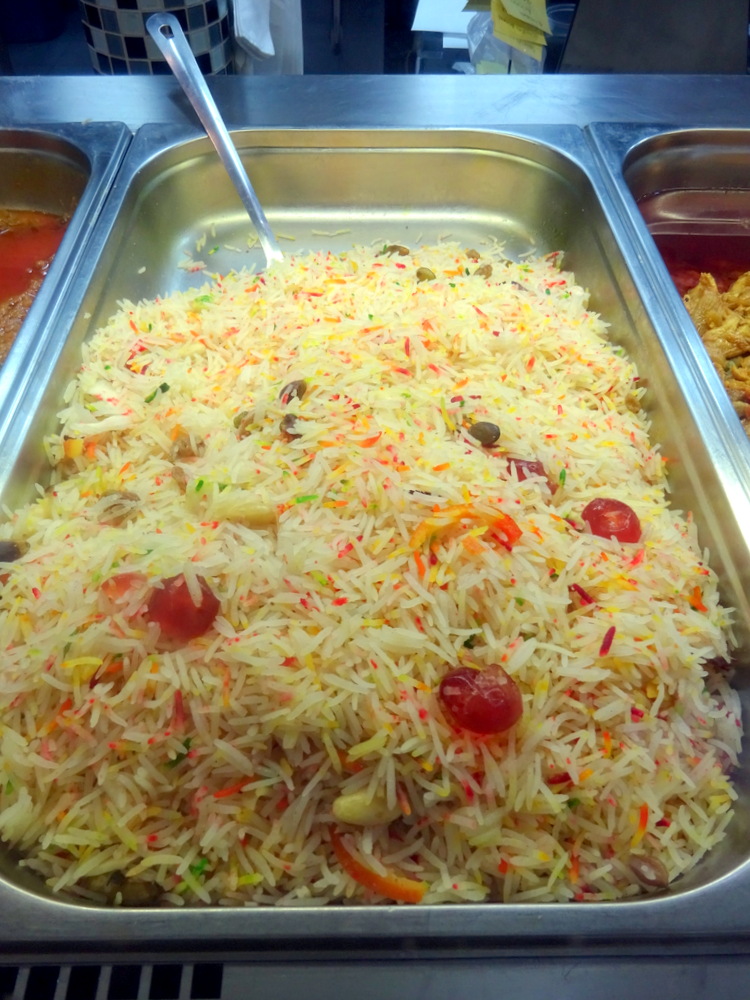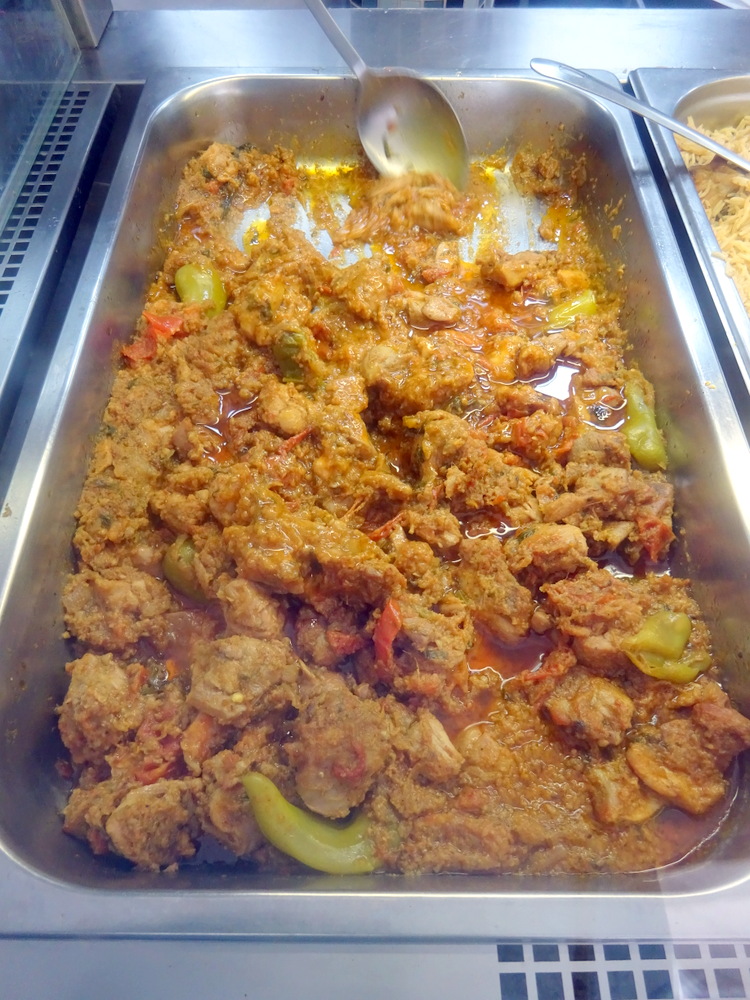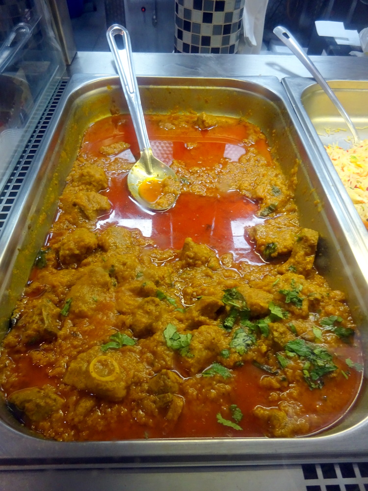 Arriving at Bahsharat G’z – drenched – the coat was draped over a spare chair. I studied the prepared Dishes, the Lamb Curry was there as hoped for. The Glacé Cherries suggested one Rice Dish was a Dessert. I asked Abbas if Potato could be added to the Lamb Curry. My plan for today was to join Mags in her favourite Curry – Aloo Gosht – even though it is not on the Menu. I expected John and Dr. Stan would share a kilo of Lamb Desi Karahi (£23.99). John texted en route to ask if it could be served – Boneless. He arrived just as Abbas was taking the Order, Boneless was possible.