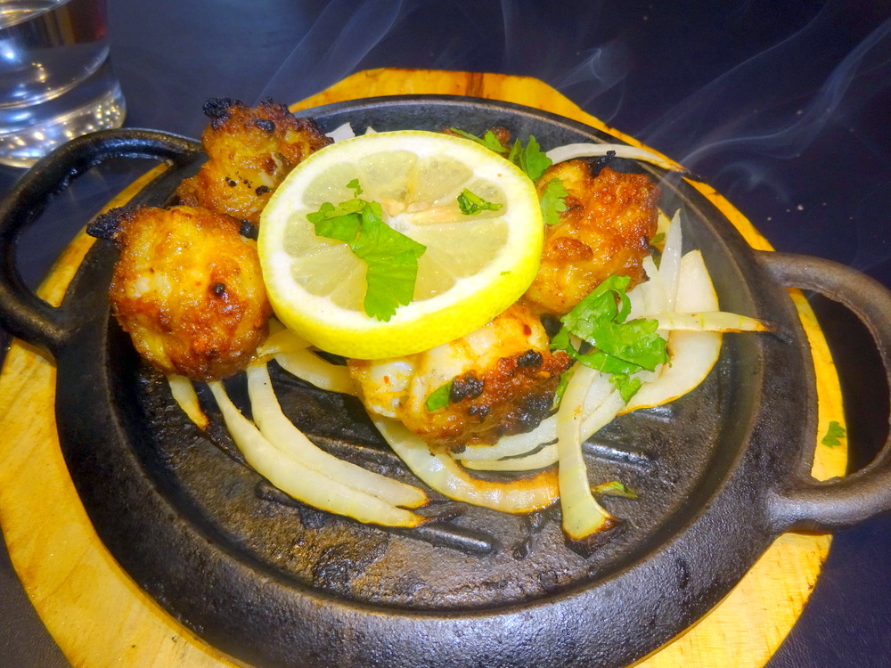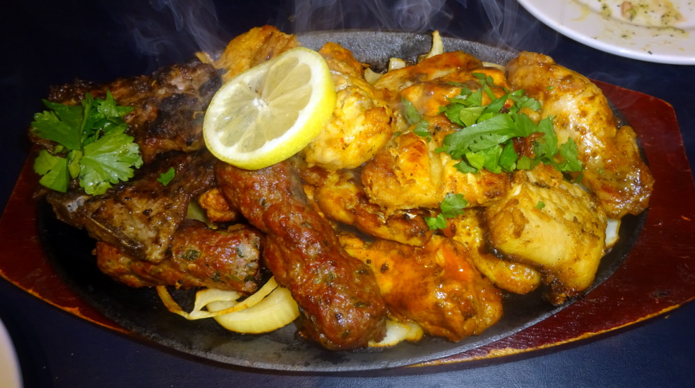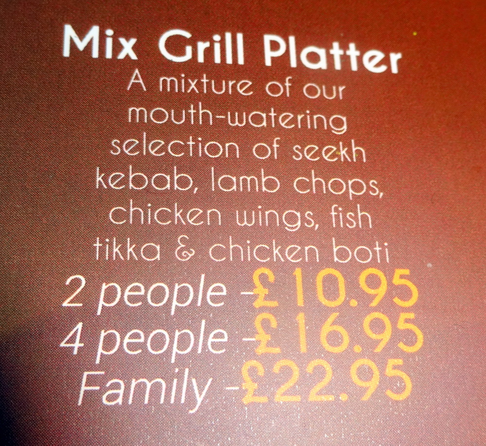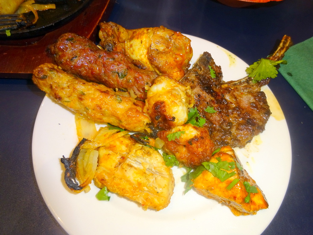 A mixture of our mouth-watering selection of seekh kebab, lamb chops, chicken wings, fish tikka & chicken boti – says the Menu.