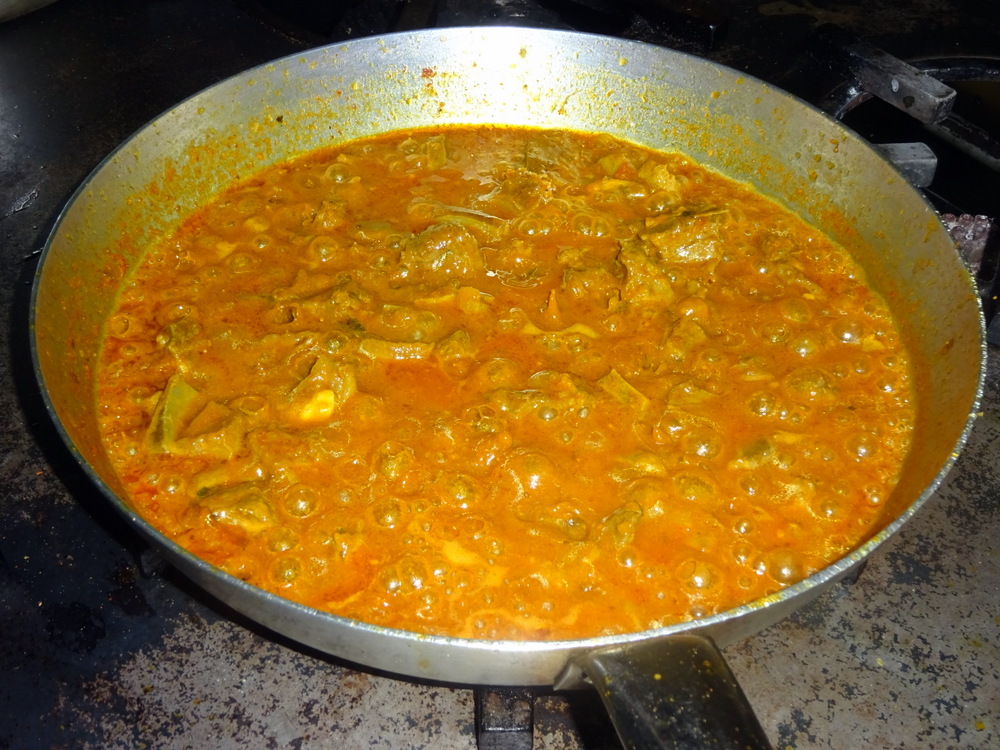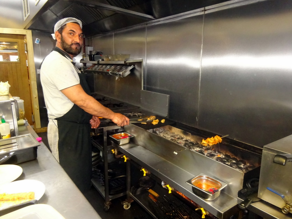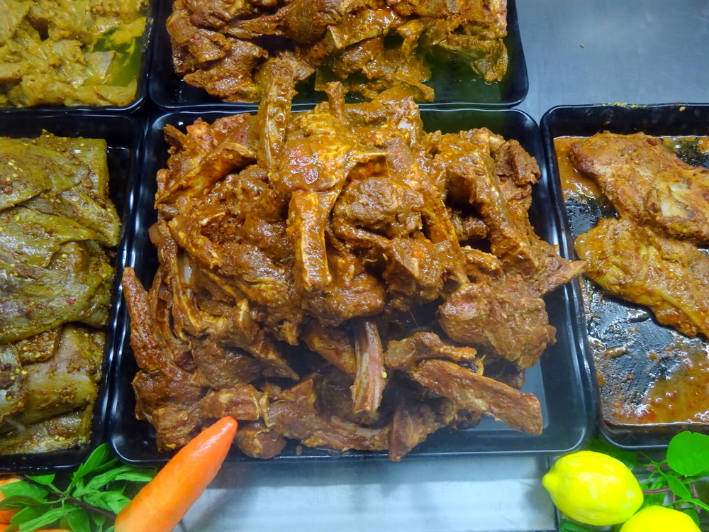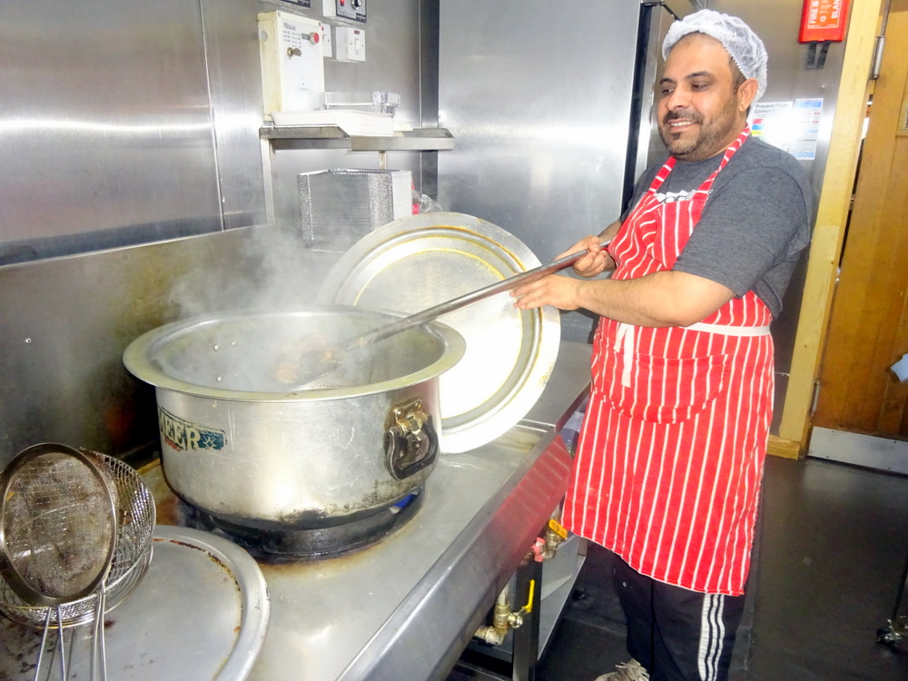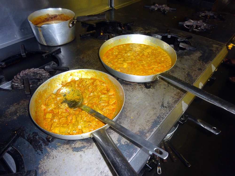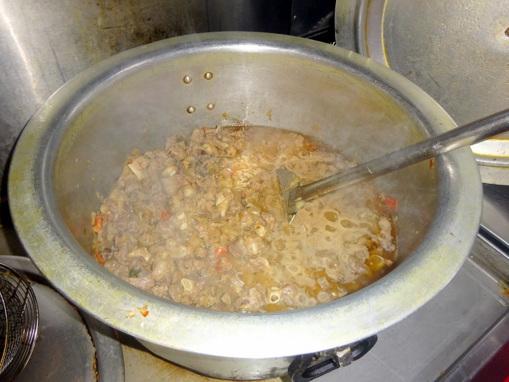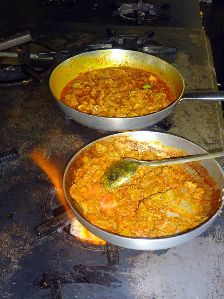 The kitchen had to be investigated, firstly to see how it was organised, and hopefully to pick up some cookery tips. The Grill Chef was already busy working on our Mix Grill Platter. It was the Bread Chef who showed me the – Big Pot – in which the Lamb was being cooked in Spice and its own juices. This would be the base of all the Lamb Curry for the next couple of days. Omar would later tell us that we had timed our visit well to see the Lamb at this stage.