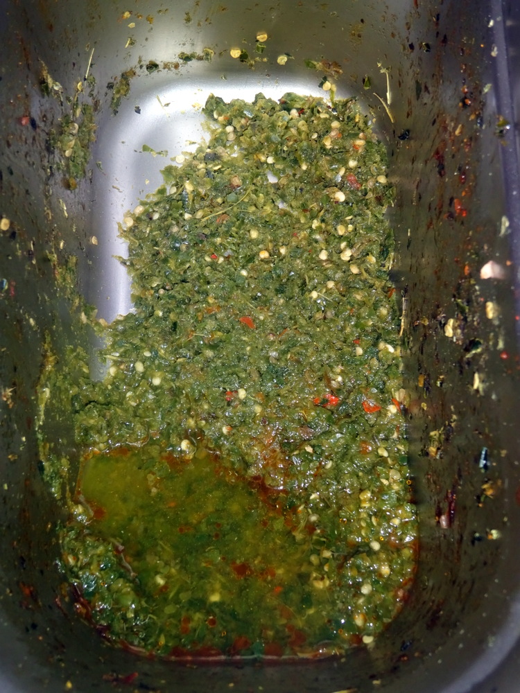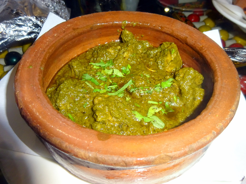 It was another Chef who was in charge of preparing the Lamb Karahi. Two pans were bubbling away, on the left was a previous order. There were other people here already? Ours was on the right. I watched as Spices were added to the Lamb from the – Big Pot. I studied the array of Herbs and Spices, Methi was there, however, the – something ground and green – had to be identified.