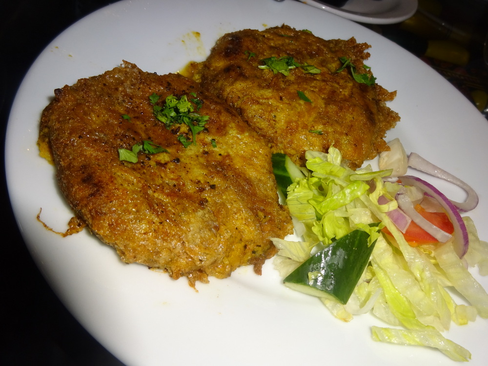 Chicken Boti is grilled, marinaded, boneless Chicken as opposed to Tandoori Chicken. This was a Succulent start to the Feast. The Chicken Wings were less Spicy, the Meat here fell off the bone, finger lickin’ good. Next up was the Fish Tikka which turned out ironically to be the poorest part of this selection. The Fish was firm, and showed no sign of flaking. We both agreed that the Fish was too dry. I don’t know what happened here. Both Chicken Seekh Kebab and Lamb Seekh Kebab had been provided. Ricky remarked that he had not come across the Chicken version until the last few years. Cheaper – was my take, and nowhere near as satisfying as the Lamb Seekh Kebab which was truly outstanding – Spicy, very well Seasoned and – Moist. This effectively highlighted that the Chicken was – drier – than the Lamb. Lamb Seekh Kebab…Mmmm. The Onions on the base of the platter had been cremated in places, still white in others, a fine array to scrape off and enjoy. Then it was time to indulge in the highlight of this platter the – Lamb Chops. One each, I could have eaten these all day. The Lamb Chops were very flat, thin, and cooked through. This was a special moment.