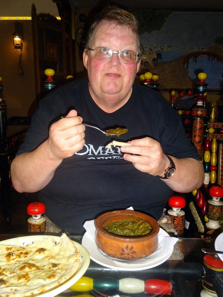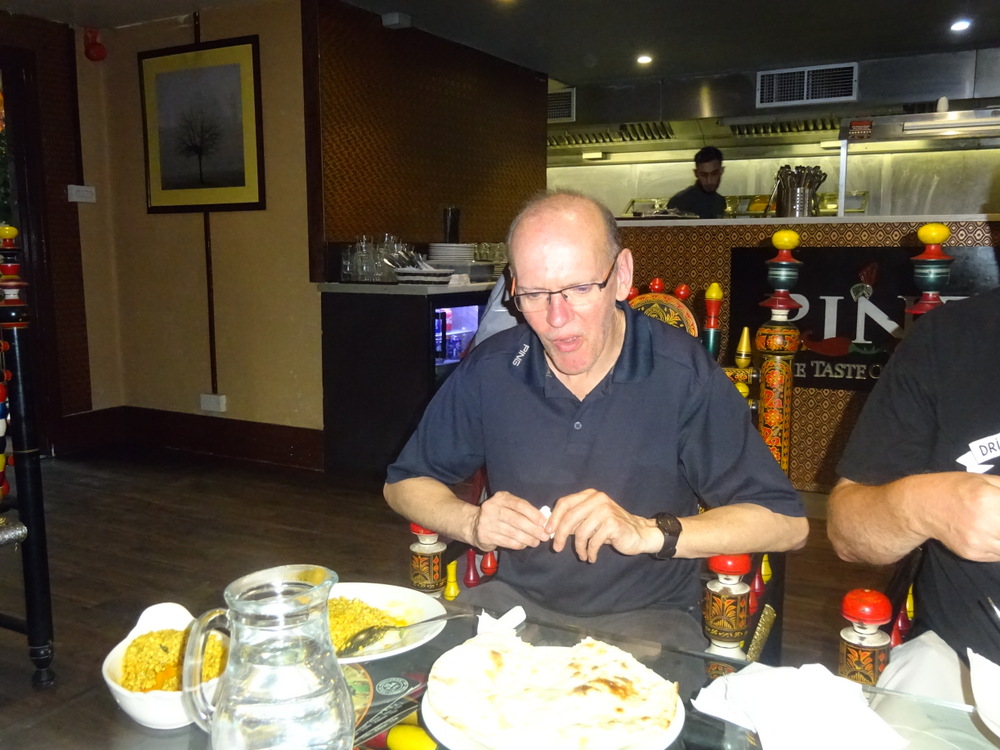 stay and sit it out, another carafe of Water was provided. The Rickmeister and Hector being abstemious? Not in terms of our food consumption, but we both knew that Ale on top of Curry, then Curry on top of Ale, could be stretching even our capacity to over-indulge. Anyway, Ricky was loving the experience of being here – to dine. We have been loyal to the Sheesh Mahal (Bradford) for so many years, let us show our appreciation and not abuse the hospitality. Our conversation with Omar was ongoing. We agreed that I would be summoned back to the kitchen at a suitable moment to see the Karahi Gosht being prepared, all part of Hector’s education and more importantly for today, another photo opperchancity. At some point in all of today’s proceedings, Ricky came out with quite a humble statement regarding – CG – as he calls Hector: