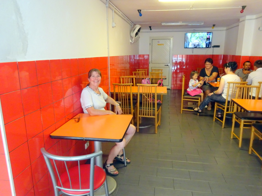One of the girls summoned me to the counter. I was invited to place the Order. When I reached Sparkling Water, she pointed to the fridge in the corner. So, I’ll fetch it myself then? And help myself to the plastic cups from the pile on the counter? Oh, I’d better take two packets with the plastic cutlery and napkin inside also.