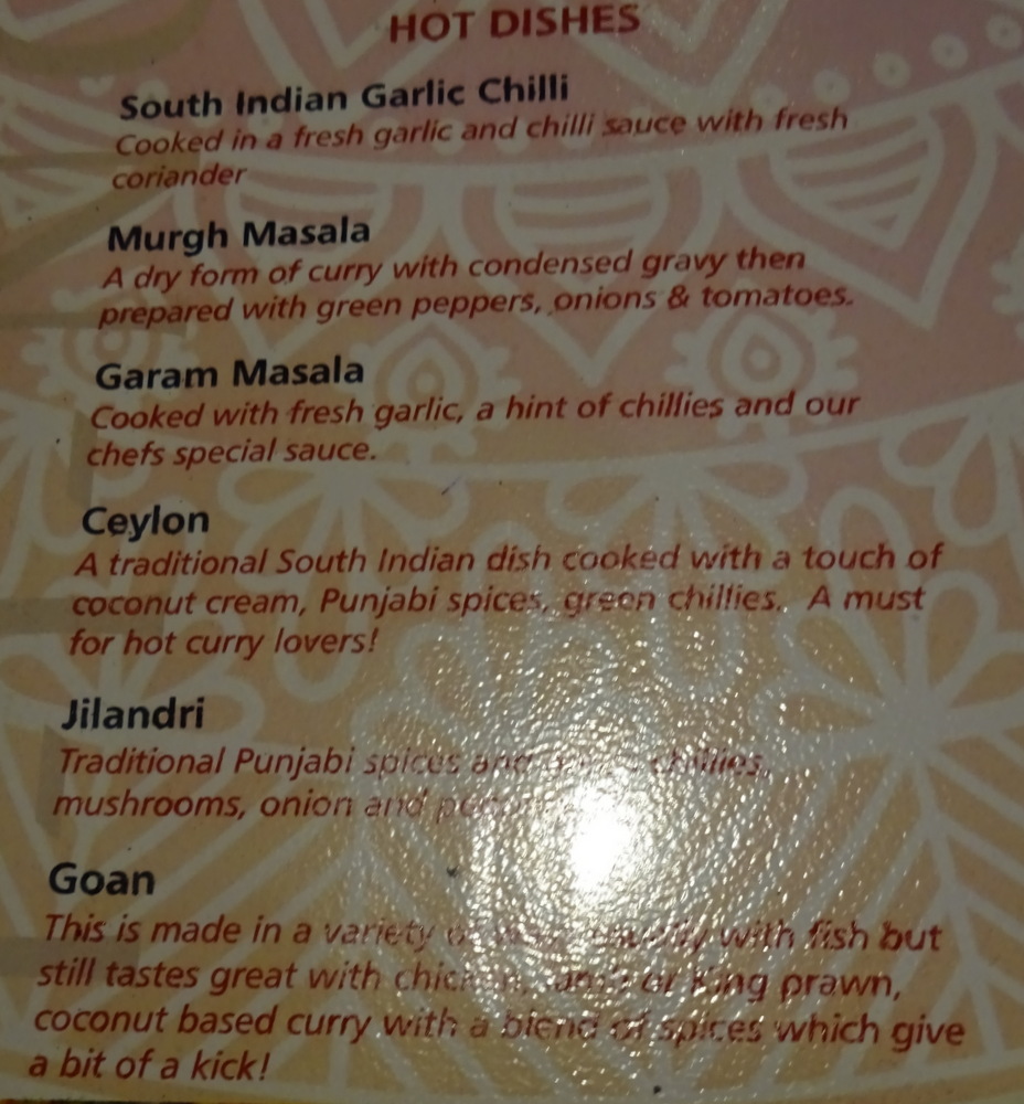 Menus were provided, a Sunday Special Menu was accompanied by the Main Menu. Each Main Dish would be accompanied by Rice and a Drink for around a Fiver (Sterling). Either this was going to be a restaurant providing excellent value, or very small portions. The merits or otherwise of laying out the Menu in this manner should evolve in this write-up. More complex Rice Dishes were available separately, but why would one order say Jeera Rice (Zl 7.00) if one was already getting Plain Rice? Having got our heads around the Menu, Hector began the task of recording the Order. It was agreed we would have Starters, Vanessa and Paul would share two Dishes, Poppadoms were mooted.
