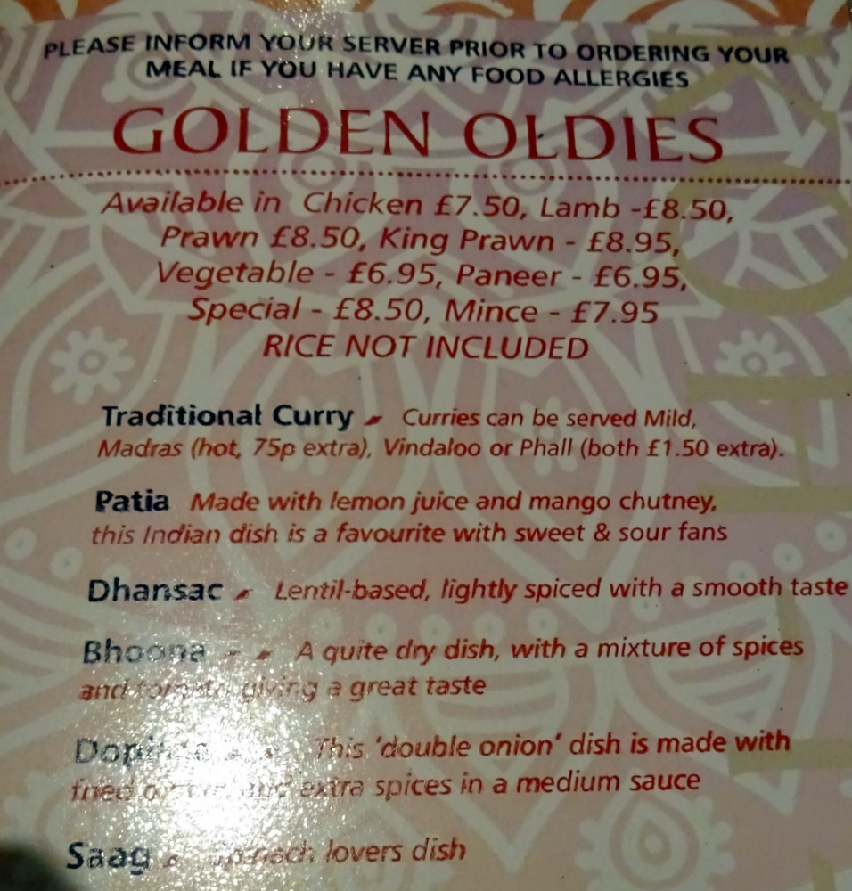 Howard was sitting outside The Curry of India as we arrived at a very punctual 12.30. Two young ladies were sat at the far end of the main dining room, I checked through the back, six of us would be better accommodated by moving tables in the main room.