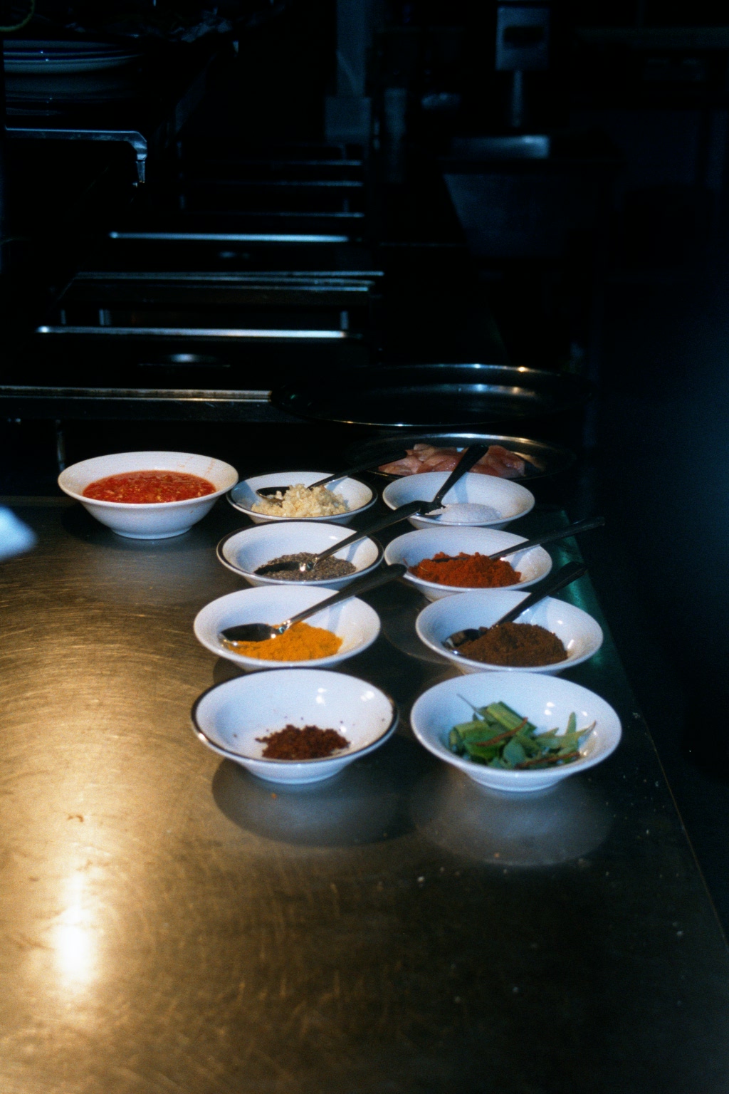 On the due day, Marg and Hector were taken into the kitchen to meet the staff and shake the hand of the Chef, all very formal. The spices were all displayed in individual bowls awaiting our inspection. Chilli powder, Turmeric, Pepper, Salt , Garlic, Ginger, Onion and an interesting bowl of Fresh Vegetables, nothing out of the norm. The next few minutes revealed everything.